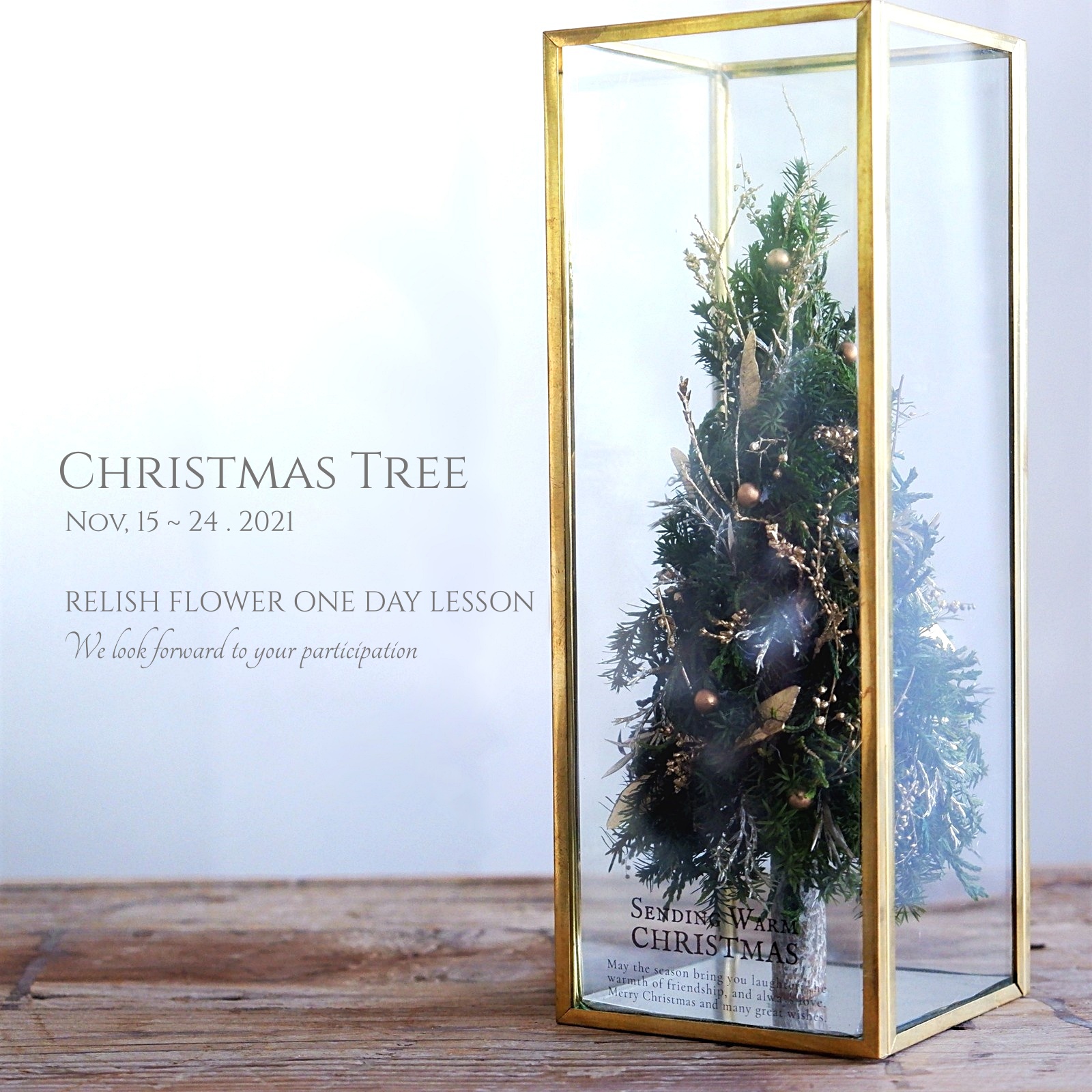プリザーブドフラワー針葉樹で小さなクリスマスツリー ガラス花器に閉じ込めて…
