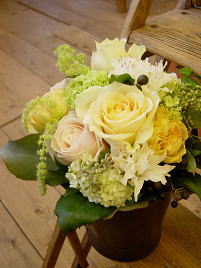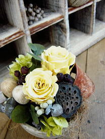 黄色のバラと実物で少し渋めに・・・。オアシス隠しにヤシの繊維を使いました。 |
