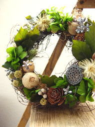 ビロードで器を包み、もみの木・ヒイラギなどの木や実ものを使いました |