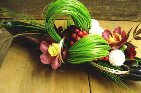 シンピや菊、赤い実など紅白の華やかな花材でお正月らしく仕上げ