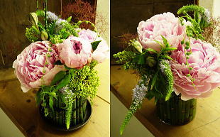 柔らかな表情の芍薬をたっぷり使ったアレンジ。ガラス花器を