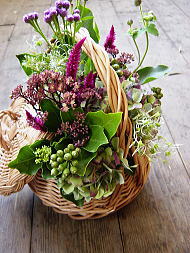 フタ付きのぽってりした籠に、秋の気配が感じられる花や草、実などを