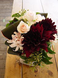 ビロードのような深い赤のブラックダリアに、甘く優しいベビーピンクの