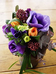 紫のアネモネを、オレンジのラナンキュラスと合わせて… 。