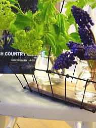 アルミワイヤーでカゴを作り、アンティークワックスを塗った木をのせて。