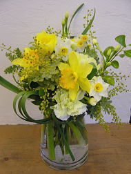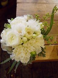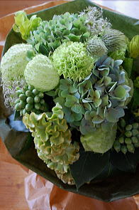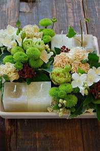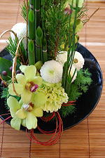 今年の生花アレンジは白グリーンの花とトクサや若松で凛と品よく。ゴールドの柳でさらに引き締めて。