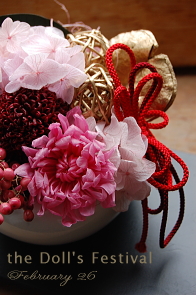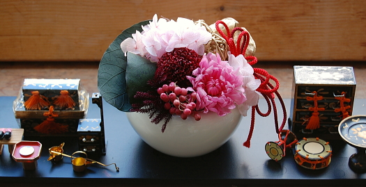 ピンク・赤系のプリザーブドフラワーで作る 桃のお節句アレンジ