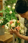 | 注) ※1 ベーシックコース入校済みの生徒さん、または当レッスンを20回以上受講された生徒さんの価格です。 ※2 資材とはブライディー・ワイヤー・フローラルテープ・リボン・持ち帰り用箱等の花材以外に必要なものです。 ※3 1輪のバラのサイズは50mm以下を使用します。 ※4 バラ以外の小花とは「アジサイ・実物・カーネーション・グリーン等」をナチュラルに組み合わせます。 |